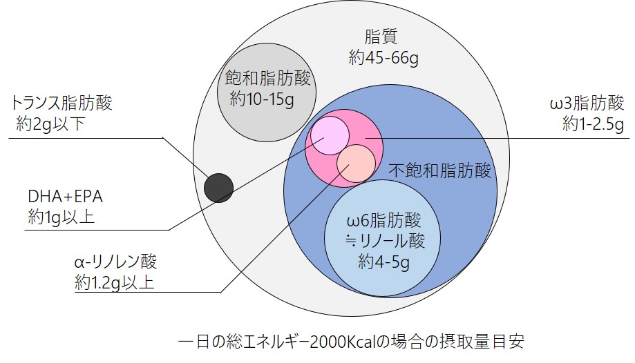 リノール酸とα-リノレン酸は、体に必要不可欠ですが体内で生成されないため、必須脂肪酸ともいわれている欠かせない栄養素です。それぞれオメガ6系脂肪酸、オメガ3系脂肪酸とも言われます。しかしこれらも摂取方法によって「危険」とうたわれてしまいます。リノール酸は体内に取り込まれると変化していき、私たちにとって必要な栄養素を生成します。しかし、リノール酸の摂りすぎで、一部の成分が生成され過ぎると、炎症系の疾患や自己免疫疾患などの原因となる場合があります。そのバランスをとってくれるのがα-リノレン酸です。つまり、体にいいと言って、リノール酸ばかり摂っていいても逆効果で、バランスが大切なのです。リノール酸の摂取量は1日4~5g、α-リノレン酸の摂取量歯1日1.2g以上が理想と言われています。そしてオメガ3系とオメガ6系の脂肪酸の比率は、1:1~1:5がいいと言われています。