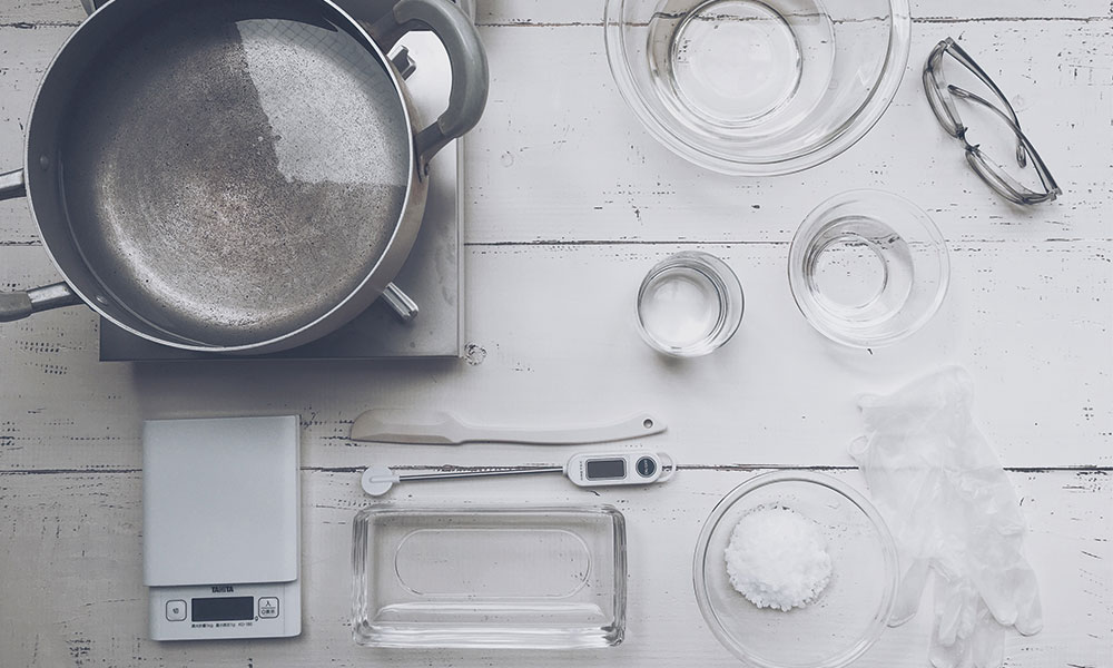 使い終わった道具で、苛性ソーダやアルカリ性がまだ強いうちの石けんがついているものはとても危険です。酢をスプレーして中和させ、キッチンペーパーなどでふき取ってから洗ってください。余った苛性ソーダはそのまま捨てられません。地域ごとに捨て方をチェックしたり、購入したお店に問い合わせてください。