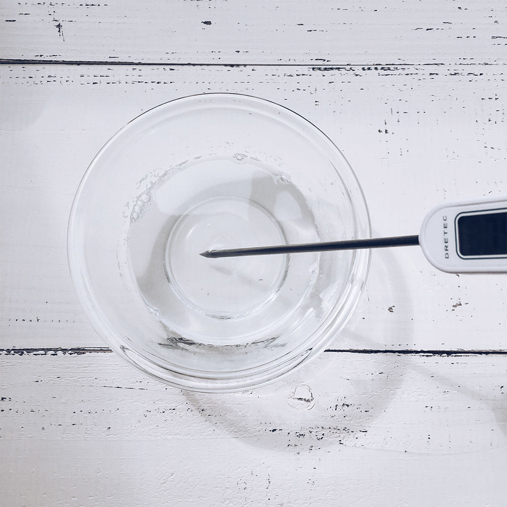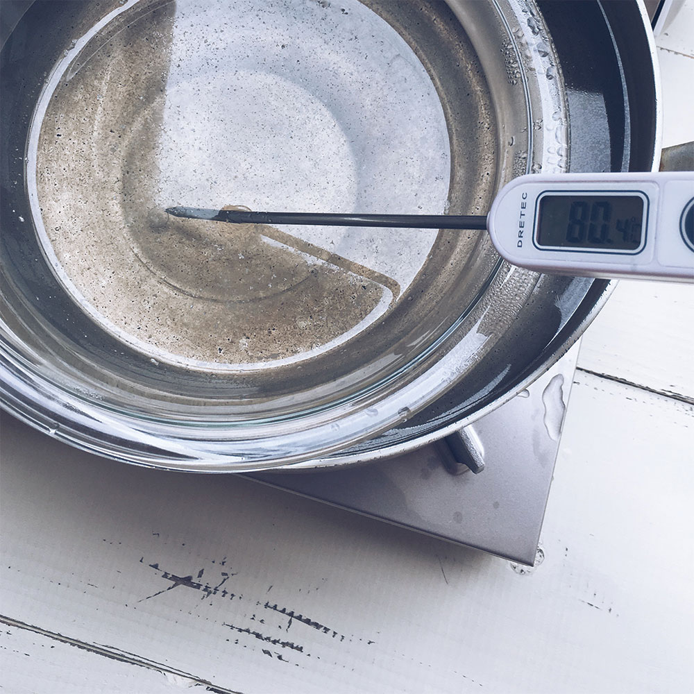 ※泡が急にでてくるので、ふきこぼれないように注意が必要です。大きめのボールを使うことをおすすめします。エタノールを加えるときに温度が低くなりすぎてしまっていたら、もう一度湯せんにかけて、60℃~80℃位まで温度を上げます。