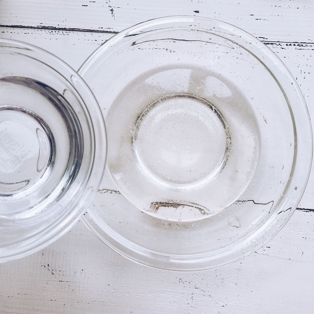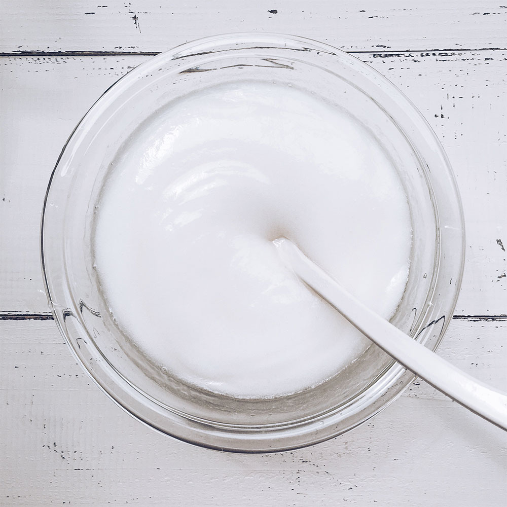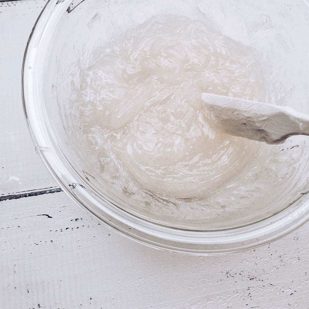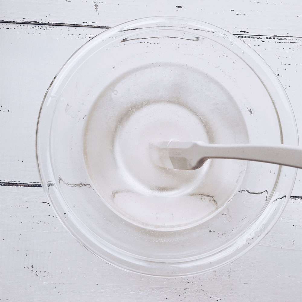 | 6.引き続き混ぜていると泡がなくなり、透明になり粘りが出てくる。 |
