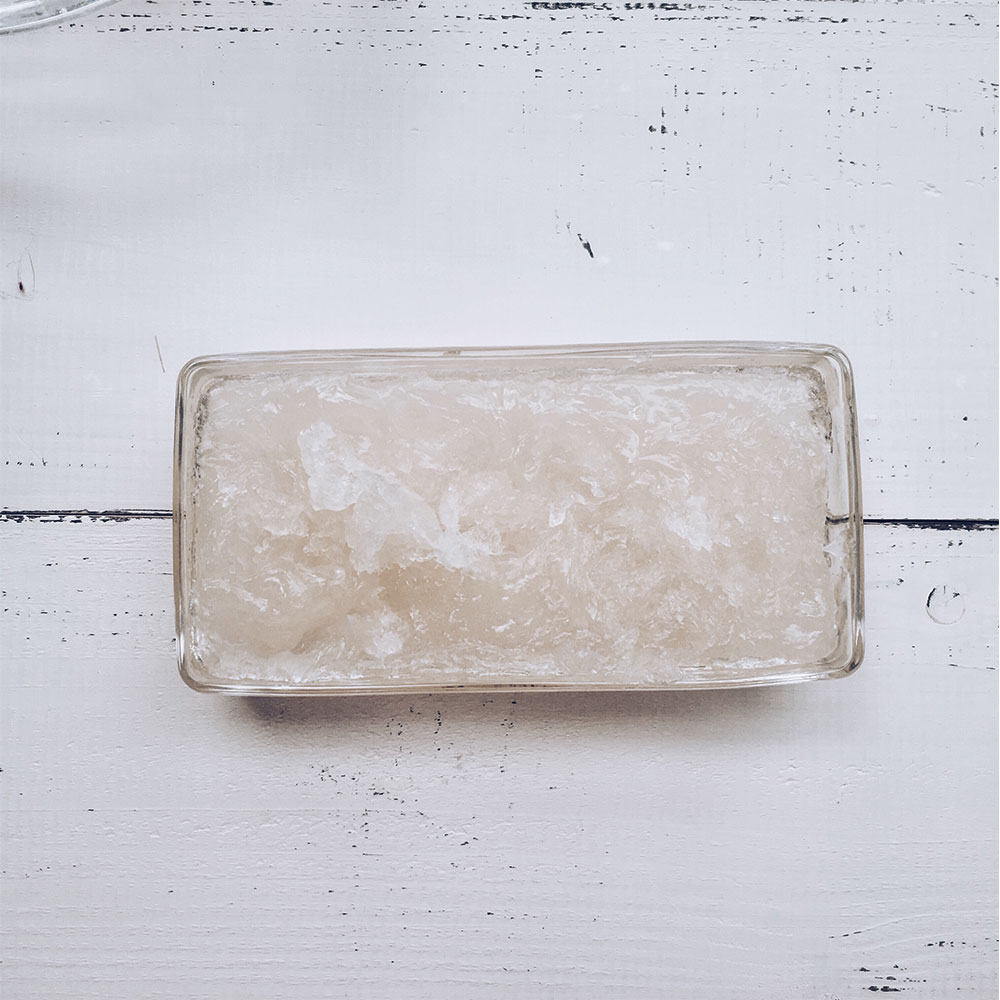 戻す割合はお好みです。石けんの素に対して、2~4倍の水分で薄めます。より効能を重視する場合は好みのハーブティーで薄めるといいです。