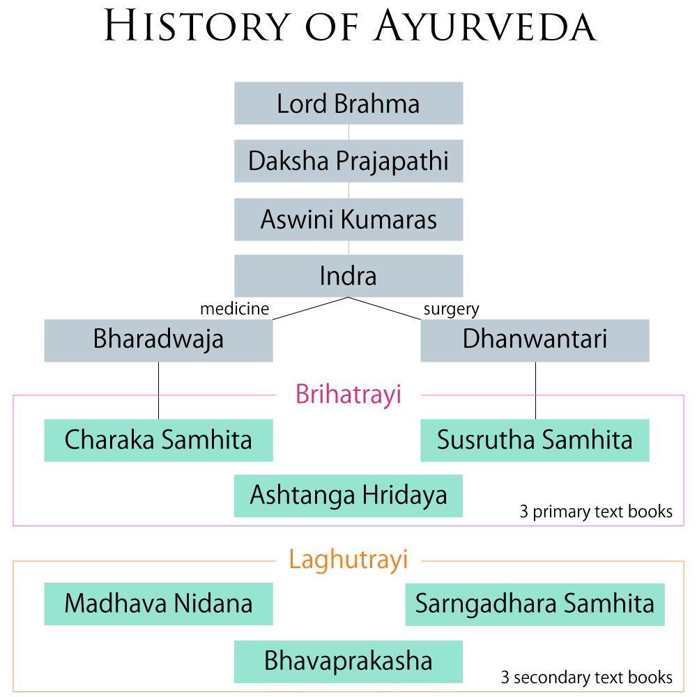 アーユルヴェーダが5000年前から現在までどのように伝わってきたのでしょうか。簡単にまとめた図がこちらです。その下の説明ではカタカナで読み方を書くのが難しいので、本来の発音と異なるかもしれませんがご了承ください。