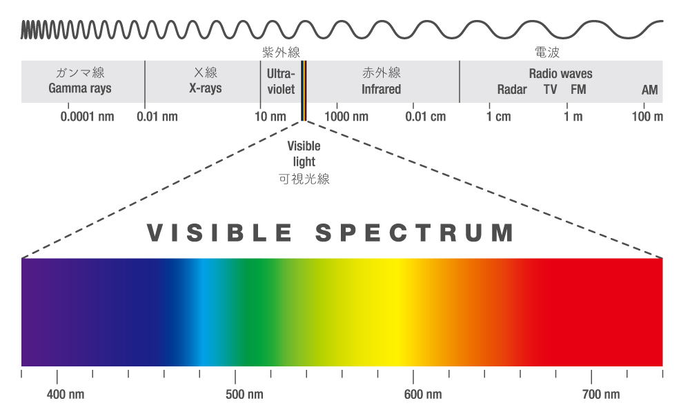 光は、紫外線、赤外線、テレビ電波やX線と同じエネルギーの一種(=電磁波)です。エネルギーは振動しながら進んでいき、その波長と振幅によって種類が違ってきます。電磁場はほとんどが人には見えないものですが、人が見ることのできる波長の範囲(可視範囲)があり、それが「光(可視光線)」になります。可視範囲は、約380nm~780nmといわれています。※1nm(ナノメートル)=10億分の1メートル