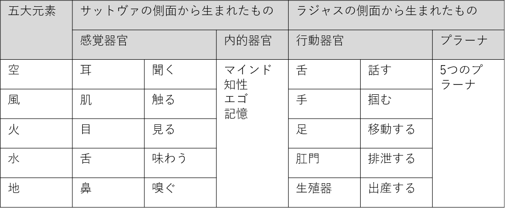 可視化されていない五大元素が初めて現れた状態では、サットヴァ、ラジャス、タマスが均衡でした。まだ何も現れる前の原因の状態、つまりコーザルボディー(コーザルの世界、原因の世界)でした。サットヴァ、ラジャス、タマスのバランスが崩れ、そのサットヴァの側面、ラジャスの側面から感覚器官、行動器官、内的器官、プラーナが生まれました。この状態でもまだ可視化はされていなく、サトルボディー(サトルの世界、かすかな世界)になります。