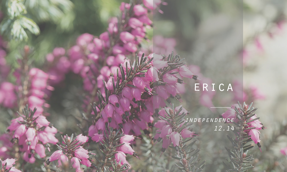 エリカは、ツツジ科エリカ属の植物の総称です。700種類程あり、大半が南アフリカに生息しています。エリカ、ヒース、ヘザーという名前の植物がとてもややこしいのでまとめます。エリカとヒースは同じエリカ属の植物総称で、学名はErica ssp.です。ヘザーはツツジ科カルーナ属の植物でCalluna vulgarisを指します。カルーナ属はエリカ属と近縁でよく似ているので混同されがちです。ここで挙げているエリカ・クリスマスパレードは、エリカの中でも特にクリスマスの時期に花を咲かせる種類のErica hiemalis cv. Christmas Paradeを指します。エリカはヨーロッパでもなじみ深い花で、花自体をヒースということもありますが、この花が生い茂る丘や山の荒れ野のこともヒースと言います。古くから荒れ野としてのヒースは気味の悪いイメージでしたが、アフリカ産の花が入ってきてから、明るい印象に変化していきました。花言葉は「自立」です。