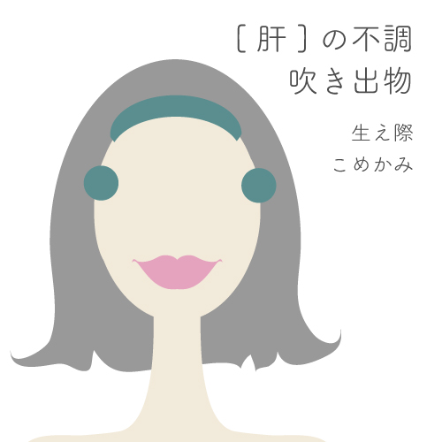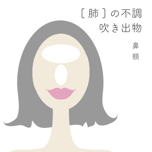 ニキビや吹き出物などの肌荒れが顔のどこにできやすいかで、体のどの部分の不調があるかが分かります。肌荒れをする部分がいつも決まっている人も多いかと思います。生え際やこめかみの肌荒れは[肝]のトラブルです。口の周りや頬の肌荒れは[脾]のトラブルです。鼻や額に出来る肌荒れは[肺]のトラブルです。鼻の下・あご・首にできる肌荒れは[腎]のトラブルです。各臓のトラブルについては画像をクリックしてください。