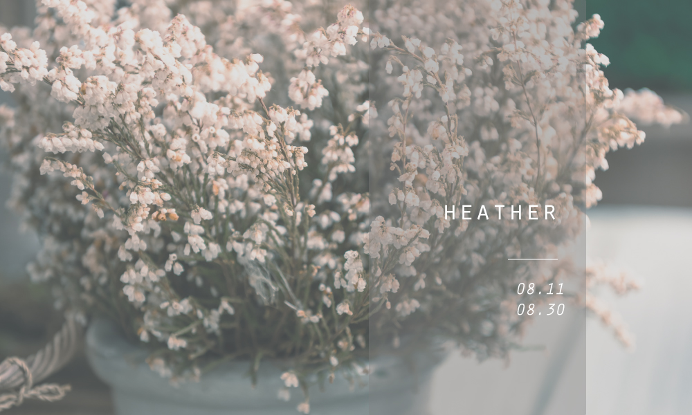 ヘザーは、ツツジ科カルーナ属の植物です。荒れ野(ヘザー)や湿原に生息します。学名のCallunaは、洗浄する、飾るという意味のギリシア語kallunoが語源です。ヴィーナスへの聖なる捧げものとされていました。古くはワイン作りにも使用されていたそうです。エリカ(ヒース)と混同されることがよくあります。