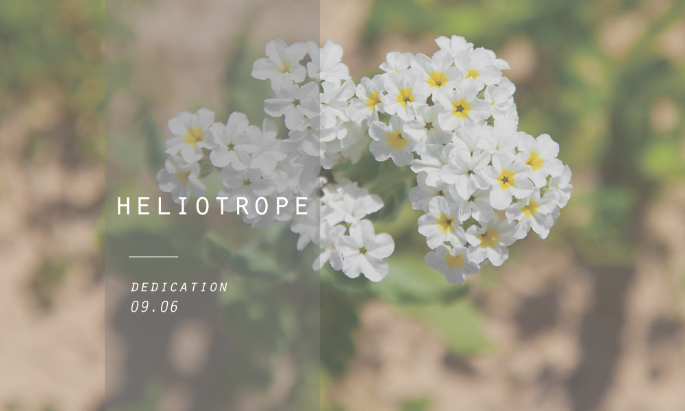 ヘリオトロープは、ムラサキ科キダチルリソウ属の植物です。甘い香りが特徴的です。学名のHeliotropiumは、ギリシア語で「太陽」を表すheliosと、「回転する」を意味するtropeが組み合わさってできています。この花が常に太陽の方を向いていて、太陽の進む方向を追うことから来ています。ギリシア神話では、クリュティエという娘が、太陽神ヘリオスに対する望みの無い愛から、ヘリオトロープへと姿を変えたと言われています。中世では花時計の一つにこの花が使われました。花言葉は「献身」です。