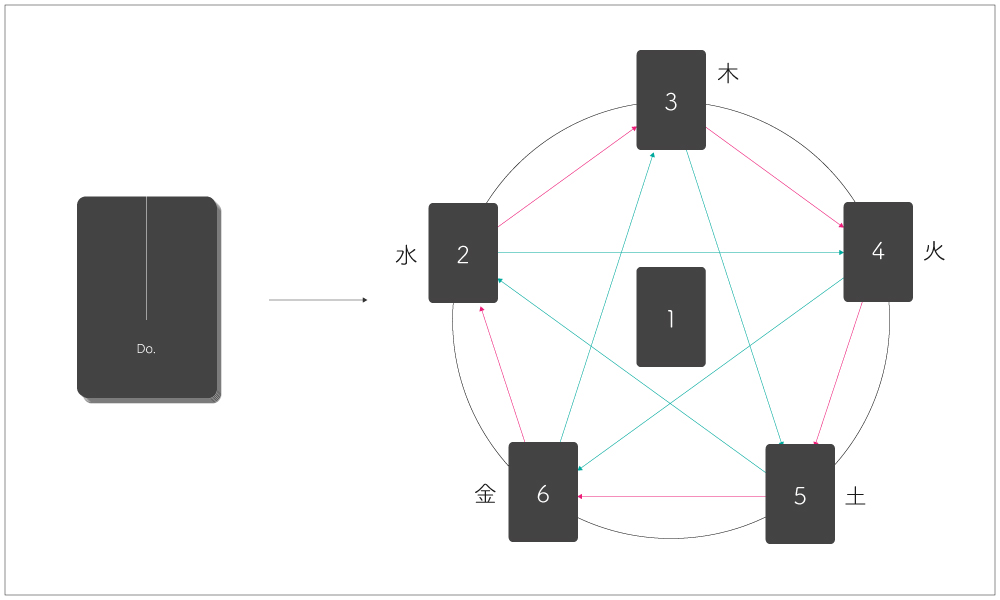 この配置は東洋の五行の五元素を示しています。ピンクの矢印の元はピンクの矢印の先をサポートする関係です。グリーンの矢印の元は、グリーンの矢印の先の数字を調整してくれる数字です。