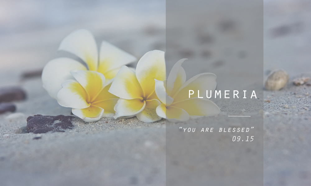 プルメリアは、キョウチクトウ科インドソケイ属の植物の総称です。300種類程があると言われています。原産はアメリカ大陸ですが、今では南国の島々の花というイメージが強いかもしれません。特にハワイ、タヒチ、フィジーなどの太平洋の島々で、首飾りや髪につけたりして親しまれています。学名のPlumeria は、フランスの植物学者シャルル・プリュミエが由来です。アメリカ大陸の植物を研究し続けた人です。花言葉は「恵まれた人」です。
