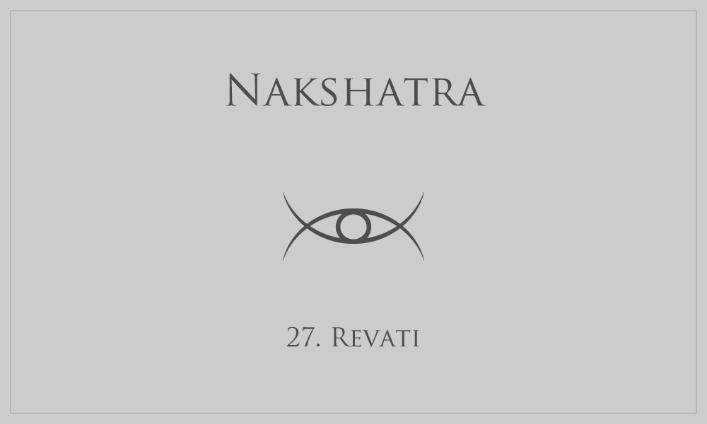対応する神はプーシャンで、12の太陽神の一人です。プーシャンは太陽の一年を2つのパートに分けたアヤナ(Ayana)と関わりがあります。一つはUttarayana、もう一つはDakshinayanaと呼ばれます。プーシャンは太陽が昇って沈む、死と再生という縁起の良い時間を支配します。新年の夜明けに太陽は死に、そして生まれ変わります。レヴァティは夜と朝、生と死の境目の夜明けと関わっています。そして光と新しい夜明けが約束されている中にある完全な静けさの時間を象徴しています。プーシャンは生きている人と死んでいる人両方をガイドします。彼は人間の移行段階の守護者で、人々が恐れや心配無しに、適切な目的地にたどり着く手伝いをしています。これはただの人生の方向性だけではなく、魂が一つの領域から違う領域に移行するより高いレベルでの方向も導きます。プーシャンはまた精子を表していて、創造の種を意味します。結婚の儀式とも関連しています。ここは二つの魂が一つに結合され、別の存在、別の魂を創ることができる場所です。ヴェーダの思想では、カップルが結婚するともはや2人ではなく神聖な結合である1つになると考えられています。