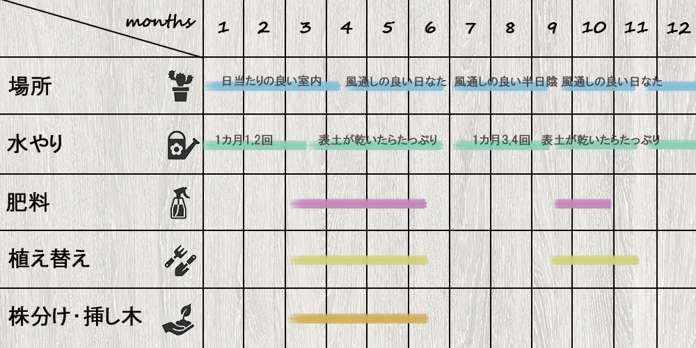 | 日当たり | 生育期の春と秋は風通しの良い日なたで管理。夏は風通しの良い半日陰、冬は日当たりのいい室内で管理。 |