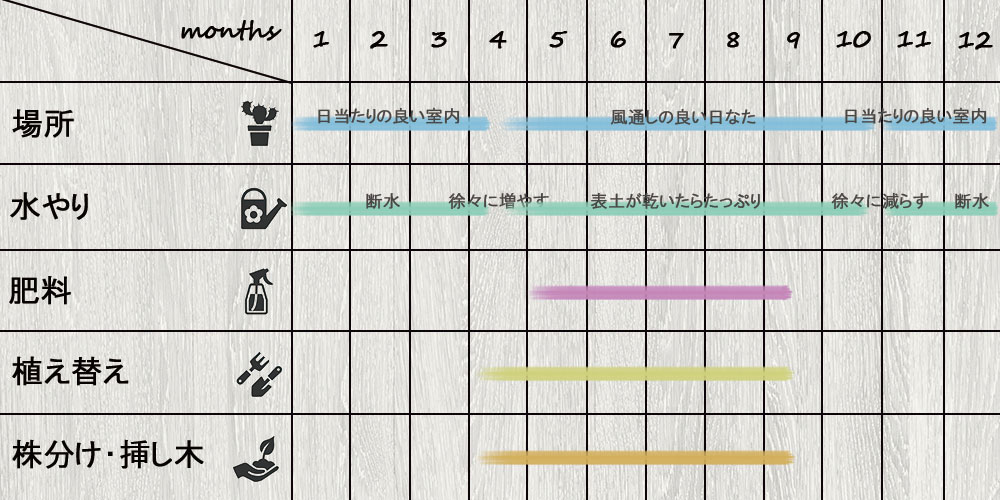| 日当たり | 一年中日なたを好みます。春から秋は風通しの良い日なた、冬は日当たりのよい室内で管理。 |