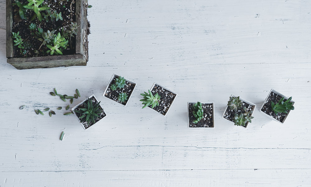 多肉植物を増やす方法には色々な種類がありますが、ここでは基本的な4種類の方法、挿し木・葉ざし・株分け・胴切りの方法を紹介しています。多肉植物は形が整っていた方が可愛く見えるので、乱れてきたら剪定や切り戻しをしながら、殖やしていくことをおすすめします。殖やす時期は、基本的には生育期に行い、充実した株を選んで行います。
